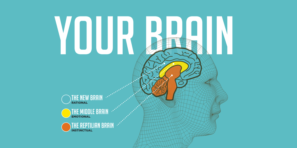 - El “cerebro reptiliano” sería aquella parte más primitiva que se encarga de mantener las funciones vitales y de los impulsos más básicos (ej: miedo, deseo sexual,…).